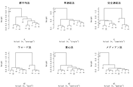 #階層的クラスタリング手法 x <- iris[1:10,1:4] #解析データ:iris 1-4列のデータ 10行分(見やすさのため限定) d <- dist(x) #初期距離行列の作成:ユークリッド距離 d2 <- dist(x)^2 #ユークリッド平方距離 hc.aver <- hclust(d,"average") #群平均法 hc.sngl <- hclust(d,"single") #単連結法 hc.comp <- hclust(d) #完全連結法(Default):"complete"指定と同じ hc.ward <- hclust(d2,"ward") #ウォード法 hc.cntr <- hclust(d2,"centroid") #重心法 hc.medi <- hclust(d2,"median") #メディアン法 op <- par(mfrow=c(2,3)) #Graphic parameter設定:2行3列画面表示 plot(hc.aver, main="群平均法") plot(hc.sngl, main="単連結法") plot(hc.comp, main="完全連結法") plot(hc.ward, main="ウォード法") plot(hc.cntr, main="重心法") plot(hc.medi, main="メディアン法") par(op)#作業前のGraphic Parameterに戻す